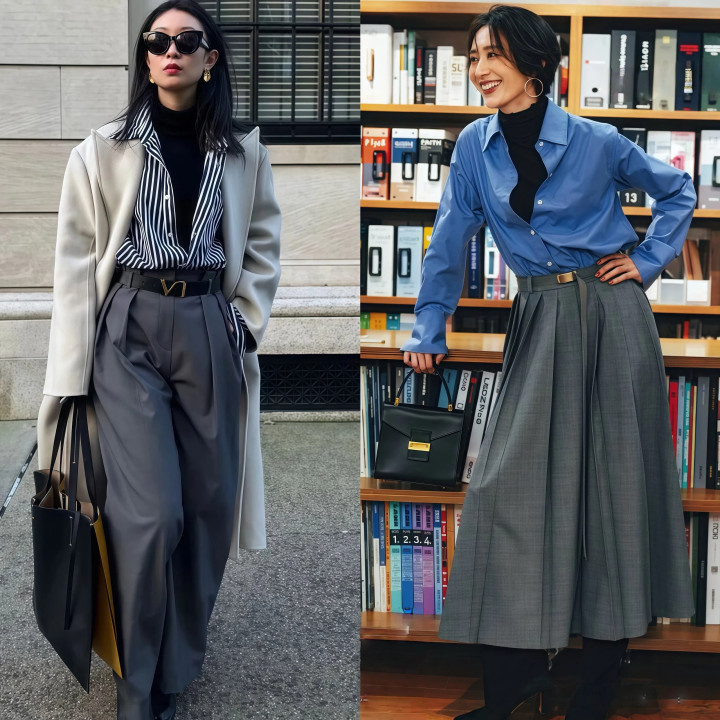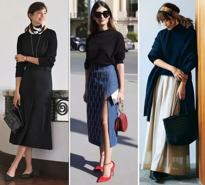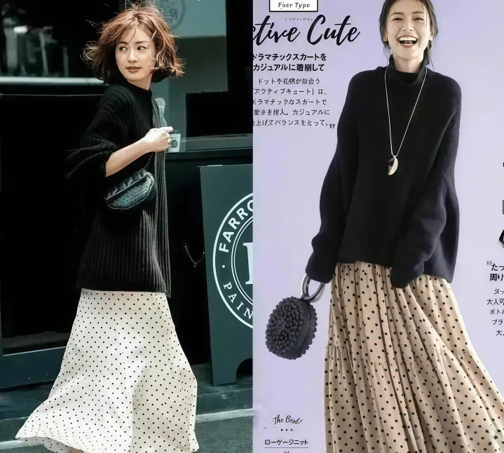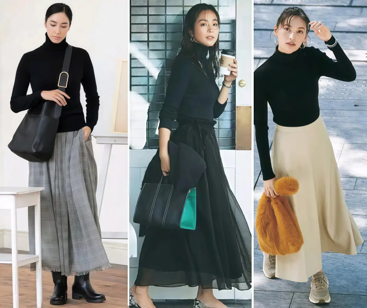不知道黑色毛衣怎么搭配?别担心,一条阔摆设计的高腰半身裙,就能解决单调感,即便是基础款的黑色高领毛衣,只需要借助裙子,便可以轻松穿出好气质,飘逸灵动的裙摆,让穿搭有了生命力。