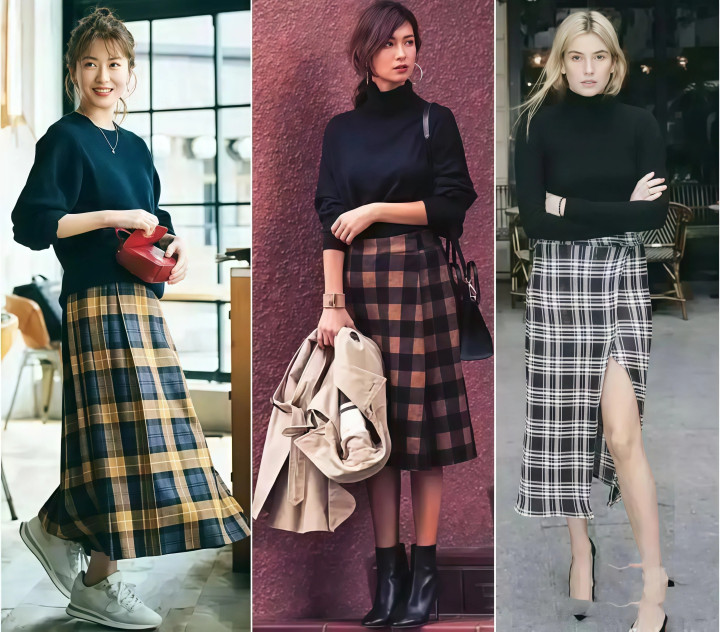 黑色毛衣的可塑性非常高,除了可以搭配纯色系的半身裙,像这种加入格子图案的长裙,充满着复古文艺的气息,简约一点的大格子,看上去更加大气,同时也能丰富下半身的立体感,“繁简结合”更显平衡状态。