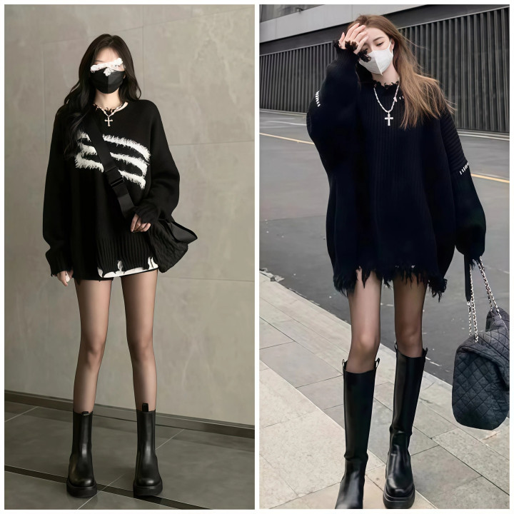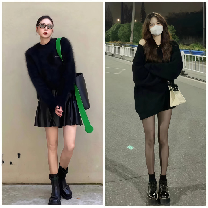 冬天穿黑色毛衣,还很适合“下衣失踪”的穿法,就好比这种遮臀长度的毛衣,带点设计感,看上去更时尚,下身搭配短裤、短裙,再配条透感比较好的黑色,利用帖子修饰腿型,穿出门回头率100%。