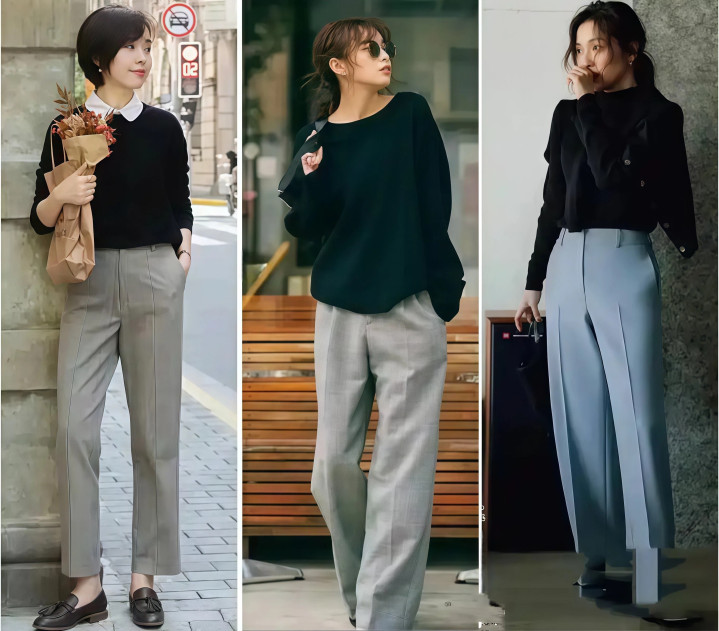 简简单单的黑色毛衣,不需要用力过猛的去搭配,对于职场女性来说,选择一条最常见的西装阔腿裤,就能穿出专业性,加入中缝线设计的长裤,视觉上可以缩窄腿围,看上去显瘦又显高。